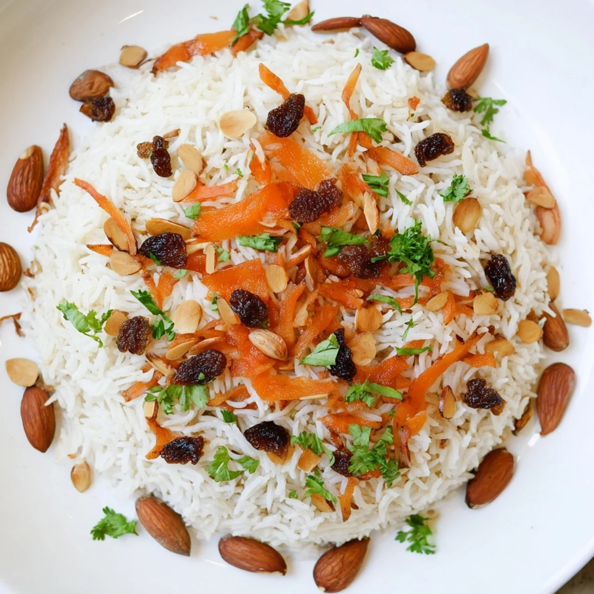 This aromatic Afghan rice features fluffy basmati grains infused with whole spices—green cardamom, cinnamon, cloves, and cumin. The rice is gently toasted in spiced oil before cooking, allowing each grain to absorb the warm, fragrant flavors. Sweet julienned carrots and plump raisins are sautéed separately until tender, then folded into the spiced rice along with sliced almonds for delightful crunch. Fresh cilantro adds brightness just before serving. This dish comes together in about an hour, with most of the time being hands-off cooking. The result is an elegant, fragrant rice that pairs beautifully with lamb or chicken, yet stands alone beautifully as a vegetarian main course.