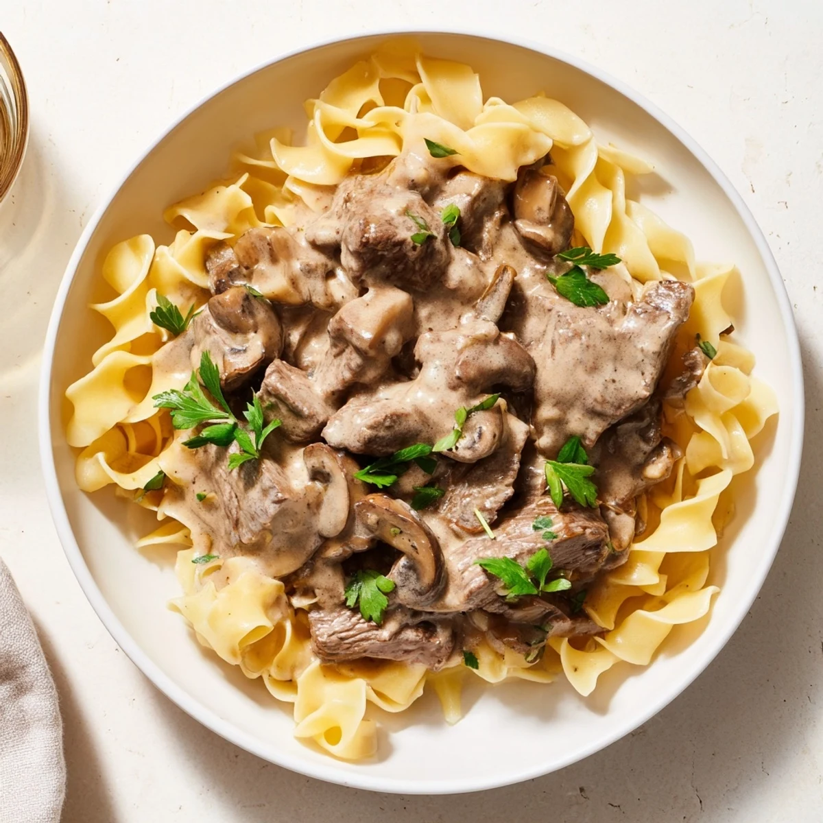 - Spoon the stroganoff over the buttered noodles and scatter extra parsley on top.