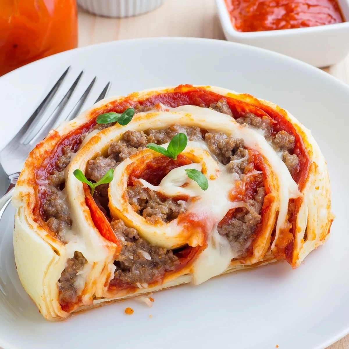 These cheesy beef and pepperoni pizza roll ups combine browned, seasoned ground beef, layers of spicy pepperoni and gooey mozzarella wrapped in rolled pizza dough. Roll tightly, slice into eight pieces, brush with olive oil and bake at 200°C (400°F) until golden and bubbling, about 12–15 minutes. Serve warm with extra pizza sauce and fresh basil; freeze baked rolls and reheat to restore crispness.