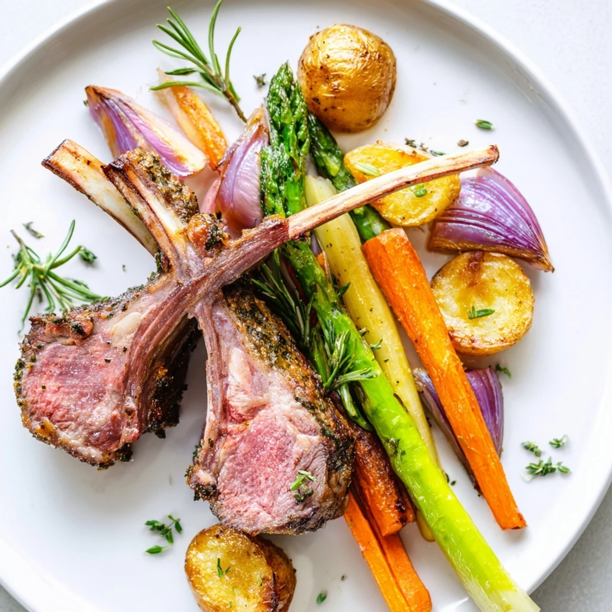 This festive one-pan meal features tender lamb chops seasoned with rosemary, thyme, garlic, and lemon, roasted alongside baby potatoes, carrots, asparagus, and red onion. Everything cooks together on a single sheet pan, making preparation and cleanup effortless while the flavors meld beautifully. The lamb develops a caramelized exterior while staying juicy inside, and the vegetables become tender and golden. Perfect for Easter gatherings or spring entertaining, this dish serves four with minimal hands-on time.