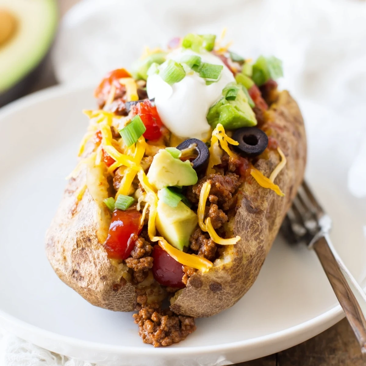 Bake large russets at 400°F until skins are crisp and centers are tender (60–70 minutes). Sauté onion and garlic, brown ground meat, then stir in taco seasoning and a splash of water to create a thick, savory filling. Split potatoes, fluff the flesh, then pile on warm meat and melty cheese. Finish with tomatoes, avocado, cilantro, olives and salsa. Swap turkey or plant-based crumbles for a lighter option; reheat gently to preserve texture.