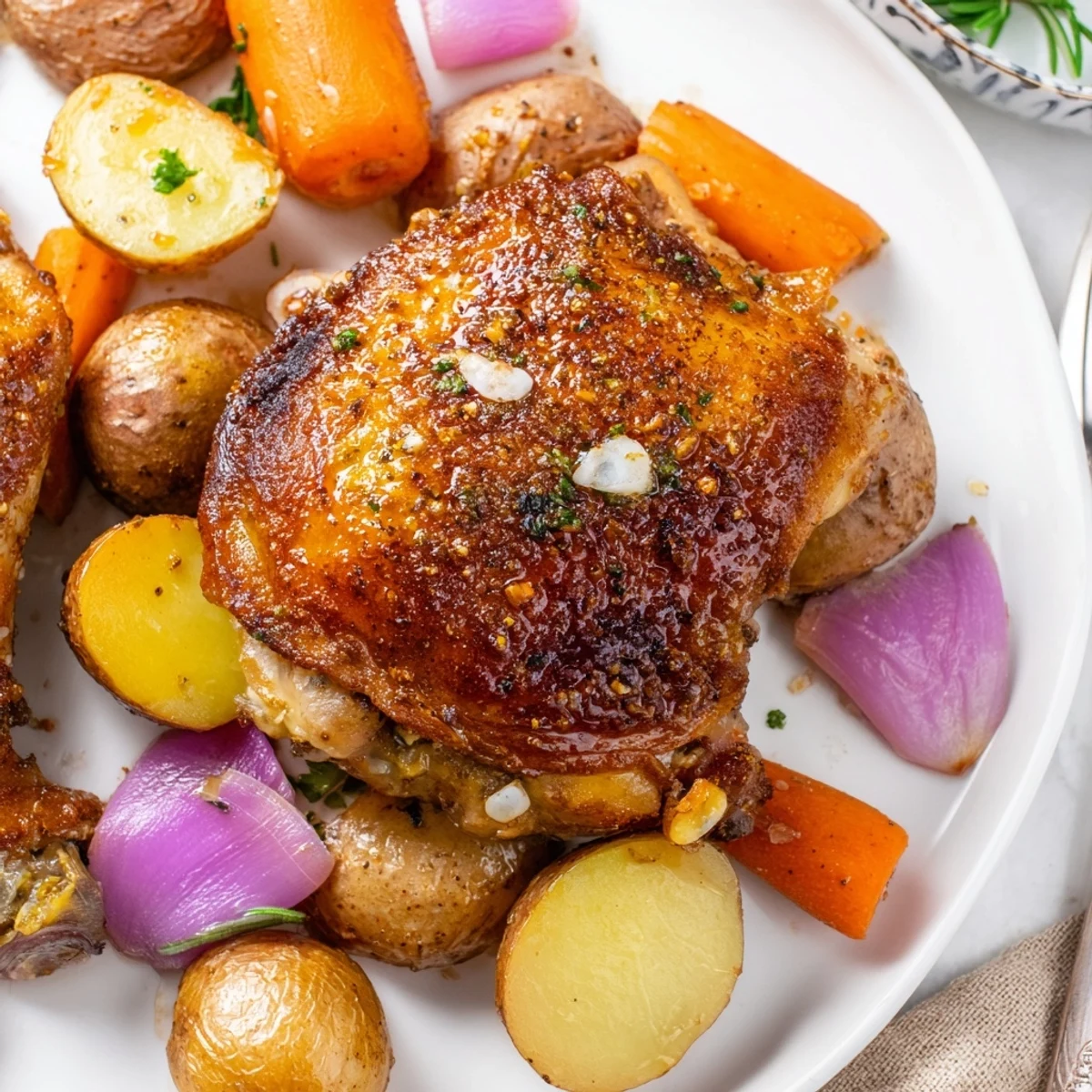 Preheat the oven to 425°F (220°C). In a bowl, toss halved baby potatoes, red onion, carrots and smashed garlic with half the olive oil, salt, pepper and herbs, then spread in an even layer on a large sheet pan. Rub chicken thighs with remaining oil and seasonings, place skin-side up over the vegetables, and roast about 40 minutes until chicken is golden and potatoes are tender. For extra-crispy skin, broil 2-3 minutes. Rest briefly and sprinkle with chopped parsley before serving.